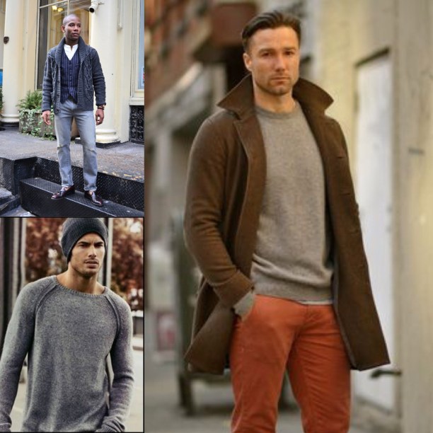 Also below we see three pictures of men wearing winter clothes. Brown/ tan chinos worn with a red jumper finished off with a white stripe. To tie this off he is wearing a heavy grey coat which makes this all look smart.