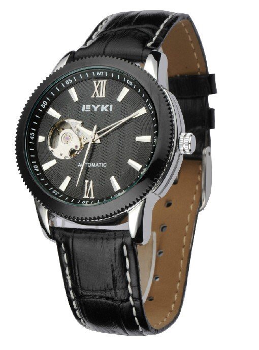 Made with a leather black strap with buckle fastener and in a metal casing with a black metal top. This watch has a black face with part mechanical on show. With a wind up function to keep it going. This is a cheaper watch but comes across as stylish and looks like it is a special events watch.